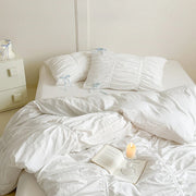 Anycozy Bedding Set White Blue Bow Ruffle Pleated Duvet Cover Fitted Bed Sheet and Pillowcases Bedroom Decor
