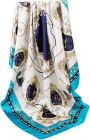 Anyyou Scarf for Women Elegant Lake Blue Satin Silk Shawl Fashion Accessories Chain Flowers Pattern Autumn Winter Scarves