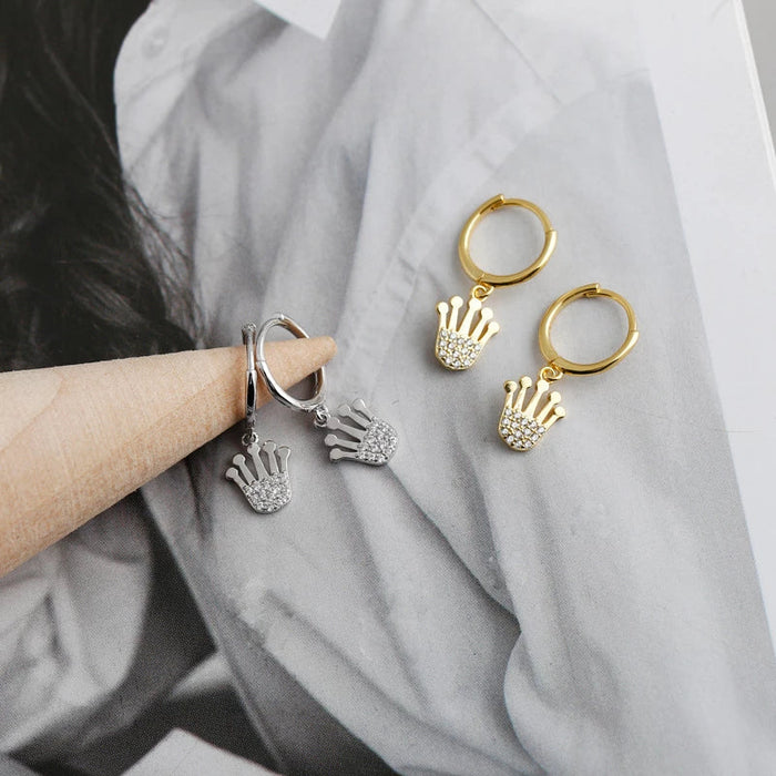 ANYCO Earrings Gold Plated Princess Crown Pave Crystal Zircon Pendant Stud For Women Girl Fashion Stylish Rock Punk Accessories Jewelry Gifts