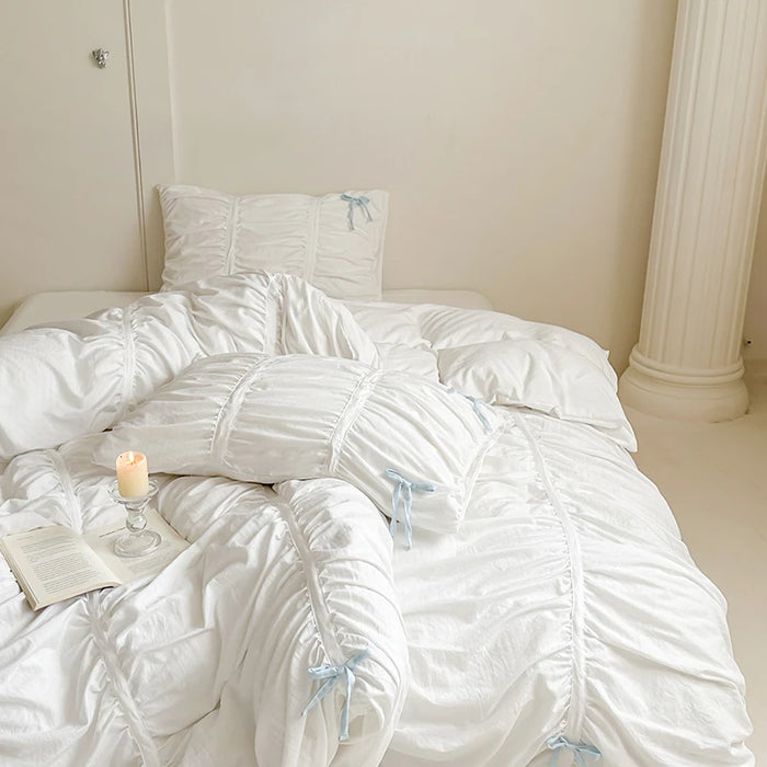 Anycozy Bedding Set White Blue Bow Ruffle Pleated Duvet Cover Fitted Bed Sheet and Pillowcases Bedroom Decor