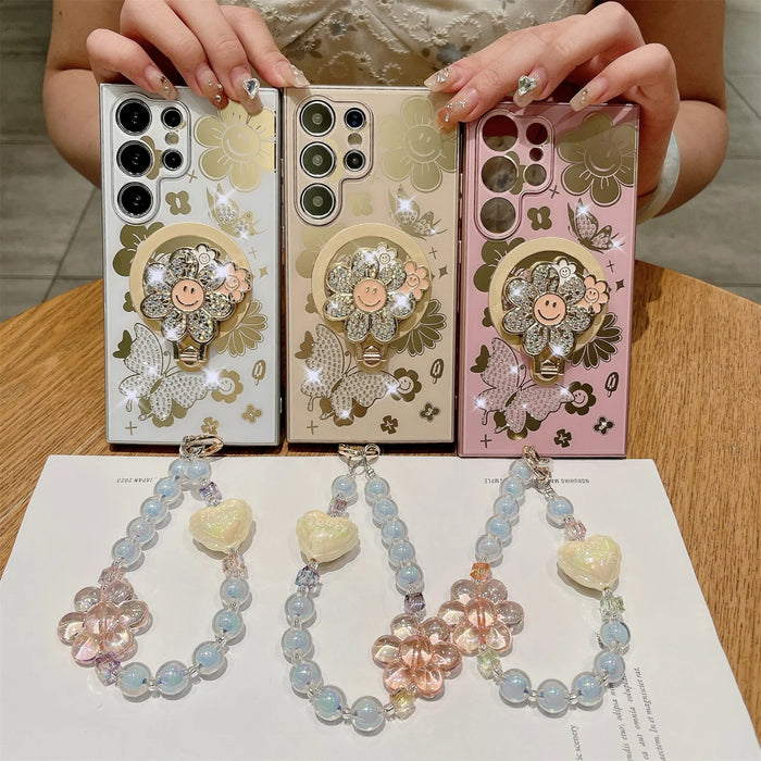 ANYMOB Samsung Case Pink Luxury Butterfly Flower Keychain Magnetic Ring Stand