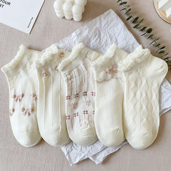 Anyfootwear 5 Pairs One Size 35-40 Summer Short Boat Invisible Chaussette Ribbon Print Cotton Ankle Breathable Women Sock