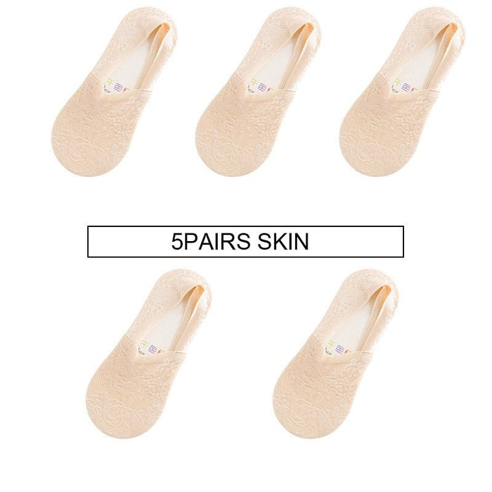 Anyfootwear 5 Pairs Size 5-9 Fashion Socks Lace Flower Style Breathable Antiskid Invisible Ankle Socks for Women Beige